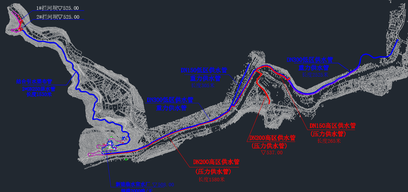 工程擬新建攔河壩 2 座,沉砂池一座,新建 2000t/h 水廠一座;擬敷設各類輸、配水管道共計 4.675km。設計規(guī)模 2000t/d,年取水量 73.00 萬 m3 。