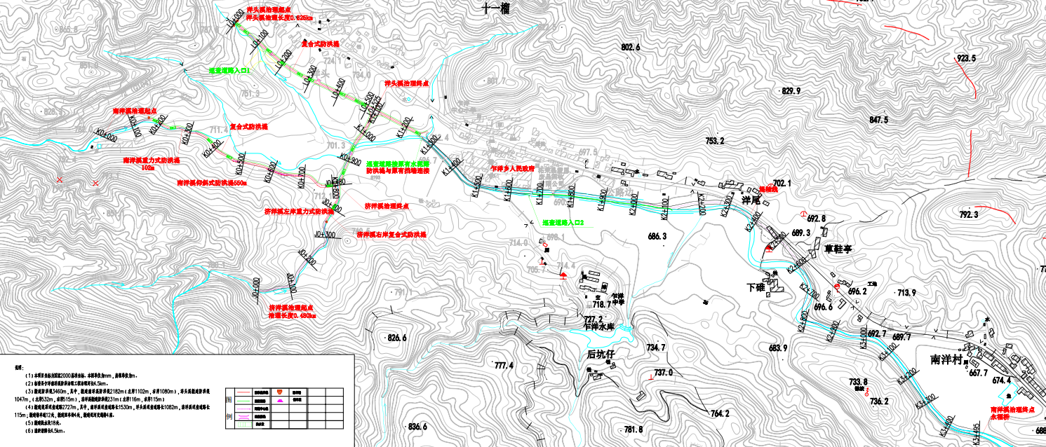 1、新建防洪堤 3460m,其中,新建南洋溪防洪堤 2182m(左岸1102m,右岸 1080m),洋頭溪新建防洪堤 1047m,(左岸 532m,右岸515m),濟(jì)洋溪新建防洪堤 231m(左岸 116m,右岸 115m)。